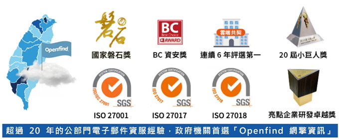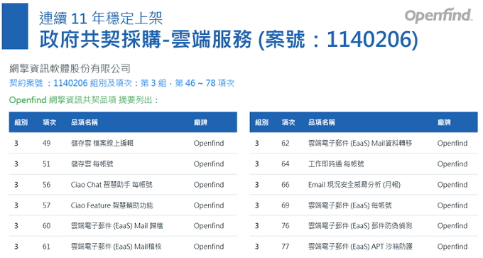 企業發展重視效率更要上雲,而且是台灣雲。政府對於國內雲端服務廠商的要求越來越嚴謹,加上台灣政府對於國際資服大廠的管控要求力十分有限,而台灣本土品牌的在地雲端服務商更能配合台灣政府規範,滿足多項評測、訪視、監管要求。雲端服務商優先選擇連續多年穩定入選雲端共契台灣品牌,長年服務穩定有口碑、SLA 不僅是口號而是實在的戰績,另也可符合台灣個資法規設定組態,台灣企業與政府機關才能安心使用。Openfind 網擎資訊獨家推出安全威脅分析月報表,能提早為用戶探勘出被駭客鎖定的傀儡帳號,是許多機關指定採購的重要資安服務。更多共契上架品項請參考下圖: