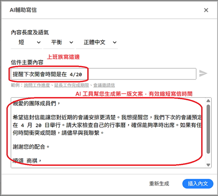 1. AI 快速寫信,擺脫空白畫面的焦慮:只要先釐清寫信的目的,輸入幾個關鍵字,AI 就能快速生成第一版文案,幫助我們更快擬好信件與對方聯繫。