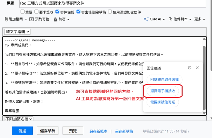 2. AI 回信建議 3 選 1,兼顧效率與禮儀:在處理回信時,AI 可以提供不同的回覆方向供我們挑選、進而依據我們的選擇生成出相應的信件內文文案。開場的寒暄詞與專案的下一步動作確認都一併擬好,大幅縮短不知道如何下筆的猶豫時間。
