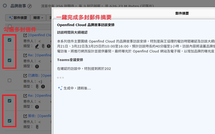 3. 陳年舊信串一鍵摘要,讓資訊交接不再斷層:在人員或事件交接時,最怕重要事務只存在承辦同仁自己一個人的大腦中。透過雲端郵件備份服務強大的多信摘要功能,能快速摘要沉睡在備份空間已久的陳年舊信,方便主管或同仁在閱讀信件時能一目十行。體感上大約只需花費十分之一的時間,就能精準掌握 50 封信件中 8 成的重點,省下海量的查信與閱信時間。當您工作年資越長,也許更能感受到陳年舊信一鍵摘要的高效。