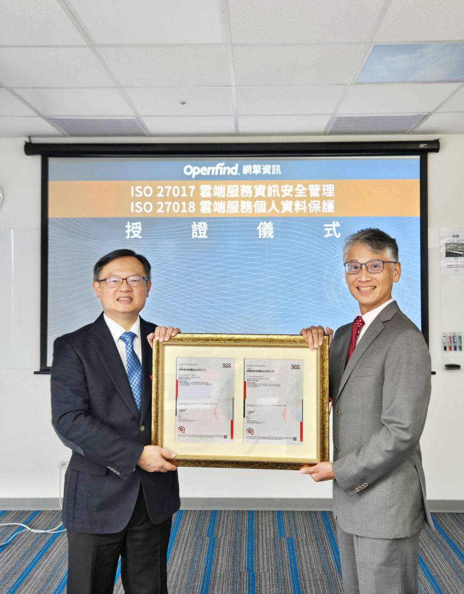 雲端服務與郵件安全領導品牌 Openfind 網擎資訊,於 SGS 2025 年度頒獎典禮中榮獲 IT Awards 「資安治理卓越獎」殊榮。SGS 年度頒獎典禮暨產業交流論壇於台北君悅酒店舉行,表彰業界在品質管理、數位創新及永續發展的傑出成果。 此外,在獲獎前,並由全球公認具專業權威的驗證機構台灣檢驗公司(SGS)審慎標準查核後,順利通過 「ISO 27017 雲服務資安管理」 及 「ISO 27018 雲服務隱私保護管理」 驗證,這份國際驗證由 SGS 台灣檢驗科技營運總監謝禎濤親自頒證,展現 Openfind 在雲端服務的資安治理與個資防護上達到國際級標準,持續以最高規格守護客戶資料安全與信任。